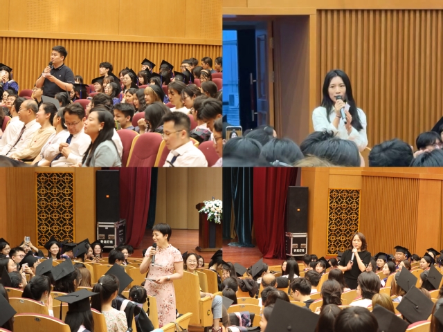 张宁老师、王丹老师、邱婷婷老师与毕业生代表倾情演唱的英、日、西多语种歌曲,带领同学们回顾在外院的青春岁月,感受那份外语的执着与热爱,共同铭记这段难忘的时光。